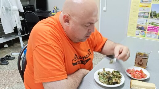 Мукбанг на работе. Баклажаны с яйцом, помидорчик и чай с сухарём. О баклажанах и планах на отпуск.