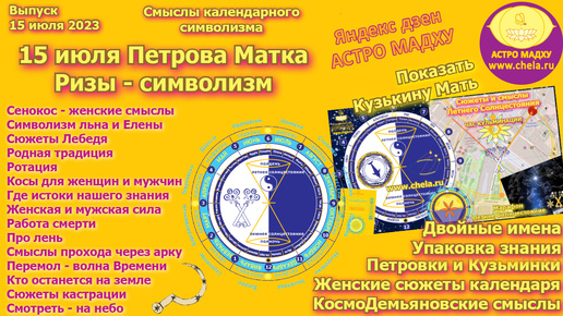 15 июля праздник Месяцеслова и Женские сюжеты Косы /Показать Кузькину мать /Ризы, Петрова Матка / Кузьма Демьян Космодемьяновки / Сенокос