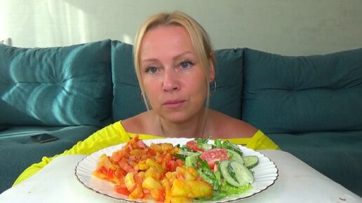 Мукбанг кабачки тушеные с колбасой и помидорками, салат летний овощной. еда.