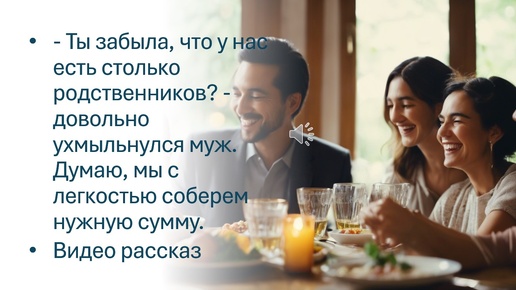 - Ты забыла, что у нас есть столько родственников? довольно ухмыльнулся муж. Думаю, мы с легкостью соберем нужную сумму. Видео рассказ