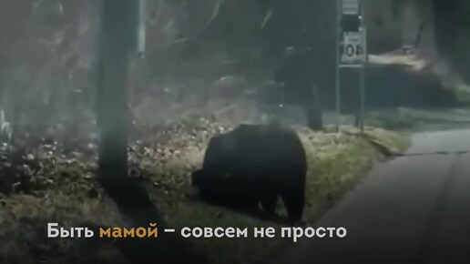 Медведица пытается перевести своих детей через дорогу, но малыши хотят поиграть