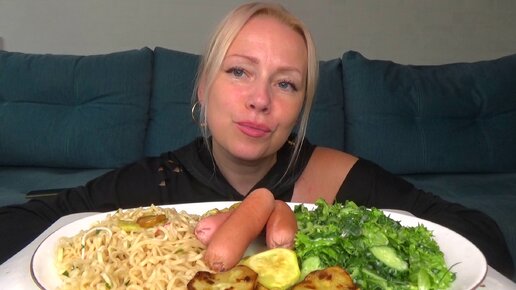 Мукбанг лапша биг бон с морепродуктами, сосиски с Горчицкой и салат с домашними овощами и зеленью. еда.