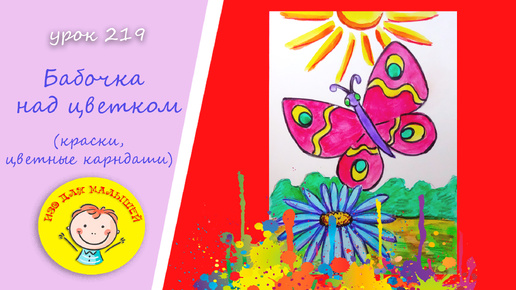 Как нарисовать БАБОЧКУ НАД ЦВЕТКОМ. УРОК 219.Тема: "бабочка над цветком"- краски, цветные карандаши