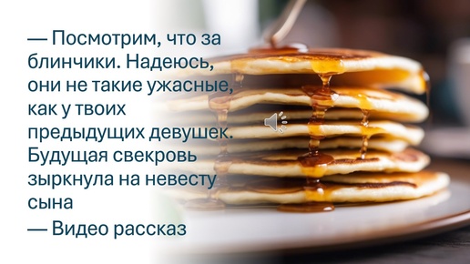 — Посмотрим, что за блинчики. Надеюсь, они не такие ужасные, как у твоих предыдущих девушек. Cвекровь зыркнула на невестку. Видео рассказ