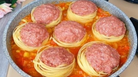 Ужин на скорую руку, когда нет времени я всегда готовлю это блюдо. Макаронные гнезда с фаршем на сковороде. Рецепт быстрого Ужина.