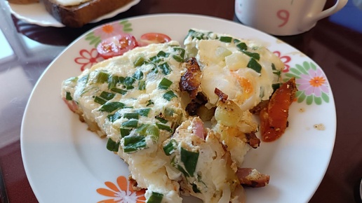 Нежный омлет из кабачков с зеленым луком сосисками и помидорами