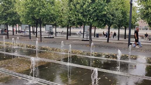 Сухой фонтан бьющий в парке Музеон, который спасает от жары. Водный комплекс рядом с новой Третьяковской галереей. Набережная Москвы реки
