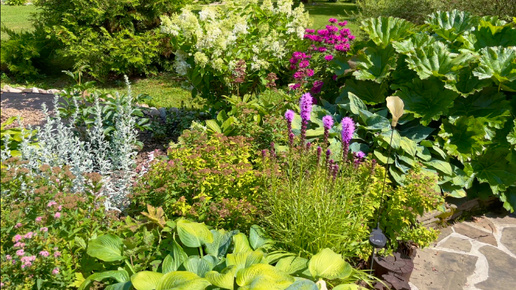Клумбы при въезде. Хосты Сагае и Голд стандарт / гортензии / астра новобельгийская / барбарисы / гвоздика / спиреи и др.