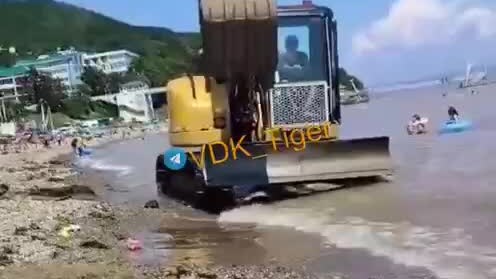 Экскаватор решил искупаться в море вместе с семьями. Приморье, Большая Тайваза