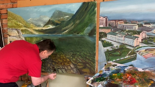 3-этап. Семицветное озеро Архыз, центр Грозного масло/ холст 100 на 150 см. Зилавди Яшуркаев.