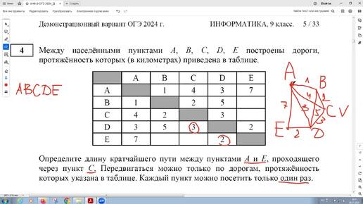 ОГЭ по Информатике, Решение ДЕМО задачи 4 Определите длину кратчайшего пути. Уметь анализировать простейшие модели объектов