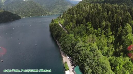 Полёт от первого лица над озером Рица в Республике Абхазия.