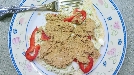 Овсяноблин на завтрак с начинкой из яйца с авокадо и куриным паштетом, на 469 ккал
