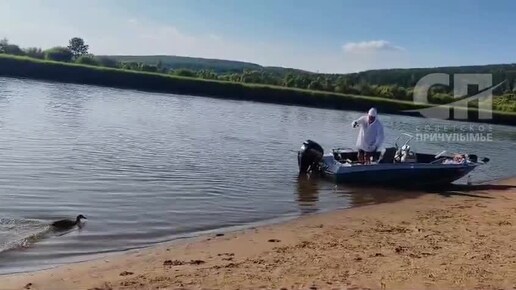 Дикая утка выпросила рыбу и съела ее, запив речной водой