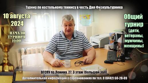 Анонс турнира по настольному теннису в честь Дня Физкультурника | 10 августа 2024 | Волгоград