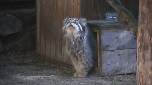Торжественный выход манула Зеленогорска из домика, пока Ласточка спит.