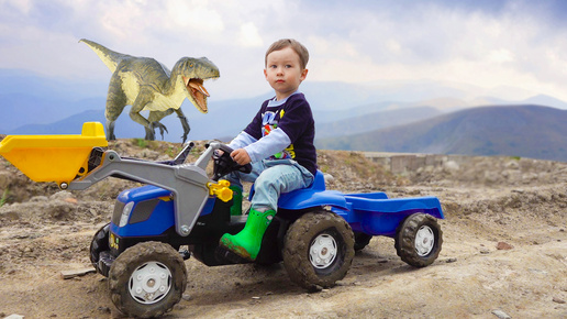 На большом тракторе малыш застрял в грязи и спас динозавра