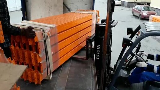 Приемка стеллажей — быстрая разгрузка пачки балок погрузчиком.
