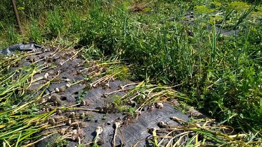 Сбор чеснока, выращенного под укрывным материалом.