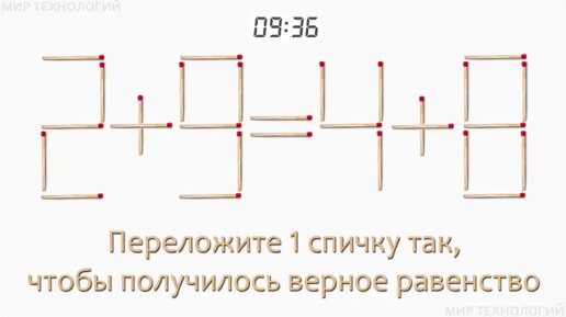 Задача 157. Переложите 1 спичку так, чтобы получилось верное равенство (2+9=4+8)