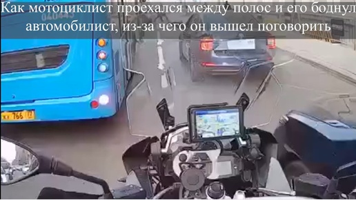 Как мотоциклист проехался между полос и его боднул автомобилист, из-за чего он вышел поговорить