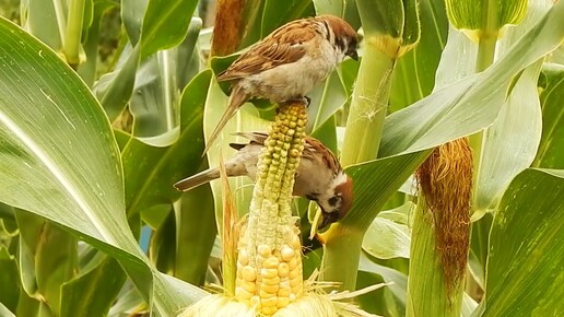 Полевые воробьи едят молодую кукурузу и выясняют отношения