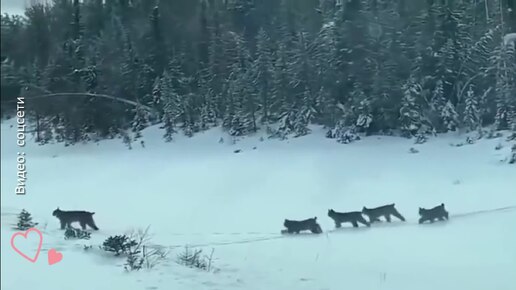Мама рысь переживает за своих малышей и переводит их через дорогу. Ну, грациозная и внимательная кошечка!