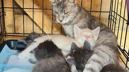 Забрала кошку с котятами из притона из предыдущего поста. Все скелеты, куча блох, глаза заплыли. Обработала. Засыпают сидя