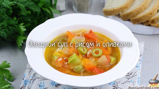 Суп без мяса, но с большим количеством овощей. Овощной суп с рисом и оливками