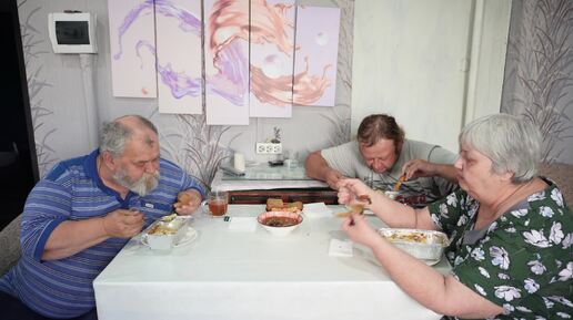 Посмотрите как вкусно кушает за столом эта деревенская семья с аппетитом рыбную запеканку которую приготовила добрая домохозяюшка мама Галя