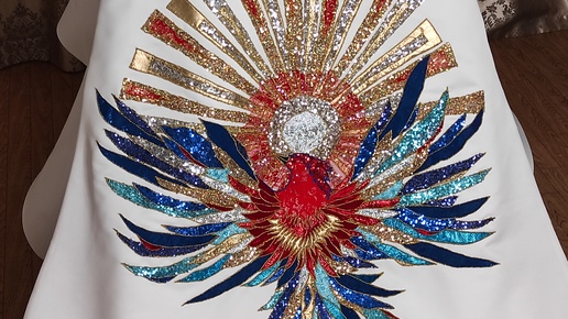 24 метра ткани на платье. То самое с лоскутным оплечьем, птицей и солнцем