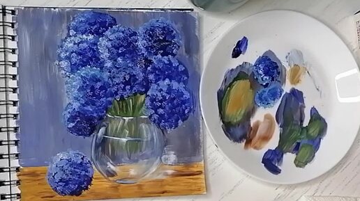 Синие цветы в стеклянной вазе рисуем в необычной технике Пользуемся подручными средствами