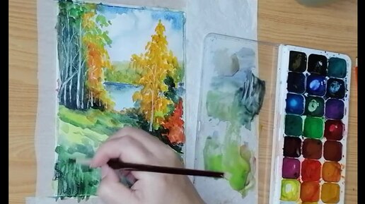 Золотая осень Рисую детской акварелью и белой ручкой, которой легко нарисовать тонкие белые линии