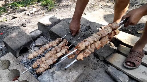 С мужем и сыном на природе Жарим шашлыки