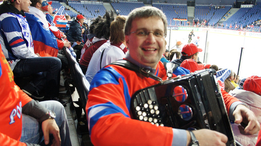Аккордеонист-ведущий Сергей Лихачев с болельщиками