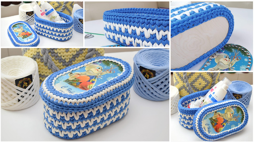 Вязание крючком Овальная корзинка шкатулка из трикотажной пряжи