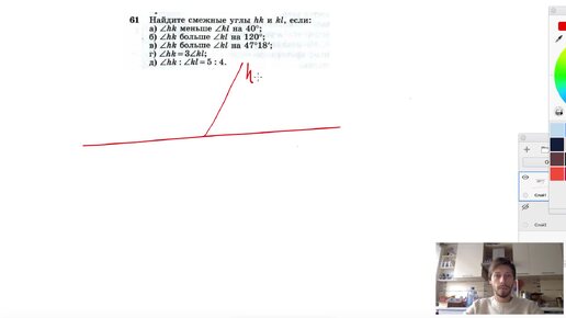 №61. Найдите смежные углы hk и kl, если a) hk меньше kl на 40°; б) hk больше kl на 120°