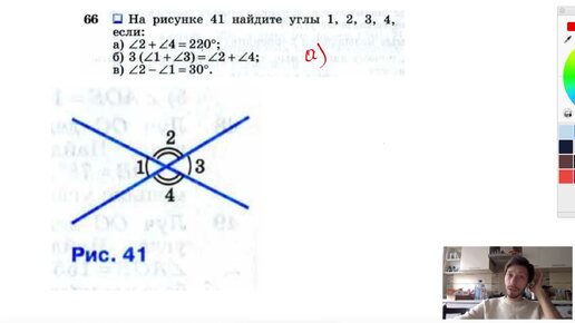 №66. На рисунке 41 найдите углы 1, 2, 3, 4, если a) 2 +4 = 220°; б) 3(1 +3) =