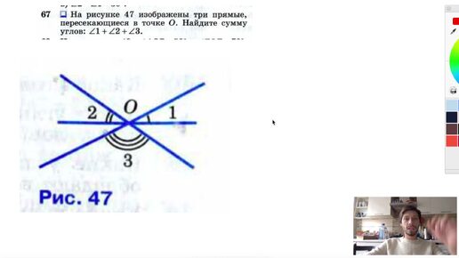 №67. На рисунке 47 изображены три прямые, пересекающиеся в точке О. Найдите сумму углов