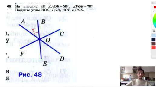 №68. На рисунке 48 AOB = 50°, FOE = 70°. Найдите углы АОС, BOD, СОЕ и COD.