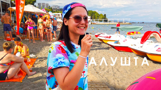 Алушта набережная Крым. Туристы отдыхают. Идём купаться. Стоимость продуктов на окрошку в магазине