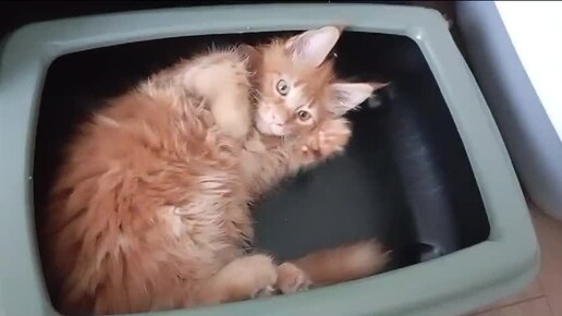 Сделал кровать из кошачьего лотка. Мейн-кун как всегда дурачится.