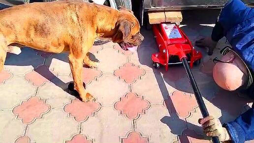 Собака немецкий боксер схлопотал от домкрата
