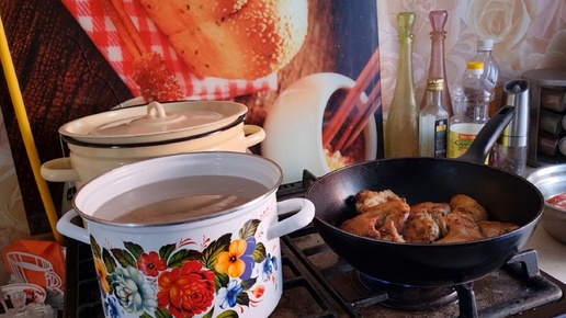 Готовлю курицу кусочками, куриный бульон и отварной картофель.