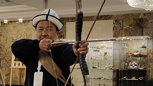 Мастер из Киргизии показывает лук 🏹 степных кочевников:рог горного козла, конский хвост,бивень мамонта. Выставка "Душа Севера". Новый Уре