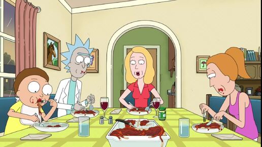 Рик и Морти обедают вместе с Бет и Саммер. Джери тоже с ними. Или Джерри, не знаю, как правельно.