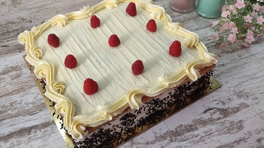 Один из самых вкусных тортов! БИСКВИТНЫЙ с малиной! 30х30 см! Большой торт ручным миксером!