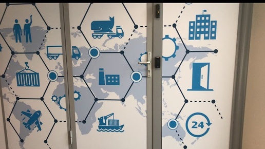 Стеклянные перегородки и двери в офисе с рисунками на стекле