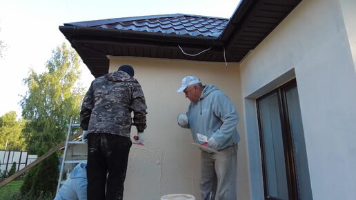 Обучаю рабочих наносить декоративную штукатурку на фасад дома. Камешковая штукатурка фактура Шуба наносится металлической тёркой