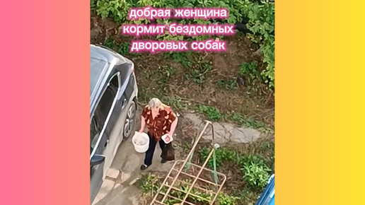 Добрая женщина кормит бездомных собачек.